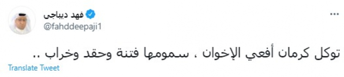 وقال في تغريدة عبر "تويتر" رصدها "المشهد العربي": "توكل كرمان أفعى الإخوان، سمومها فتنة وحقد وخراب".