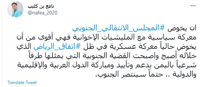 وقال في تغريدة عبر "تويتر" رصدها "المشهد العربي": "أن يخوض المجلس الانتقالي الجنوبي معركة سياسية مع المليشيات الإخوانية".