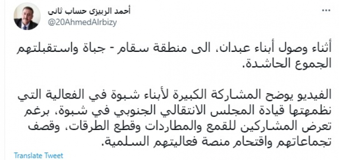 وقال في تغريدة عبر "تويتر" رصدها "المشهد العربي": "أثناء وصول أبناء عبدان، الى منطقة سقام - جباه واستقبلتهم الجموع الحاشدة".