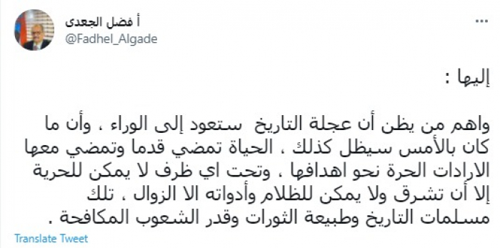 وكتب في تغريدة عبر "تويتر" رصدها "المشهد العربي": "واهم من يظن أن عجلة التاريخ ستعود إلى الوراء، وأن ما كان بالأمس سيظل كذلك، الحياة تمضي قدمًا وتمضي معها الإرادات الحرة نحو أهدافها".