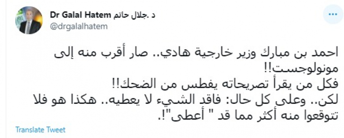 وقال في تغريدة عبر "تويتر" رصدها "المشهد العربي": "أحمد بن مبارك وزير خارجية هادي.. صار أقرب منه إلى مونولوجست.. فكل من يقرأ تصريحاته يفطس من الضحك".