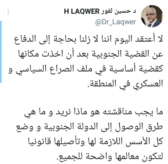 وقال في تغريدة على حسابه بموقع التدوين المصغر تويتر، اليوم إني: "لا أعتقد اليوم أننا لا زلنا بحاجة إلى الدفاع عن القضية الجنوبية بعد أن أخذت مكانها كقضية أساسية في ملف الصراع السياسي والعسكري في المنطقة".