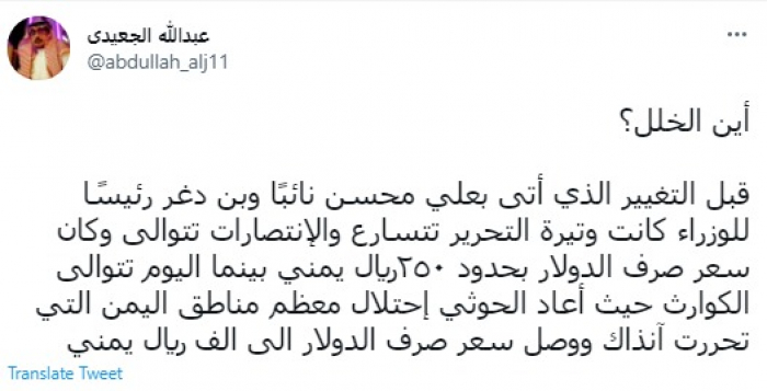 وقال في تغريدة عبر "تويتر" رصدها "المشهد العربي": "أين الخلل؟.. قبل التغيير الذي أتى بعلي محسن نائبًا وبن دغر رئيسًا للوزراء كانت وتيرة التحرير تتسارع والانتصارات تتوالى وكان سعر صرف الدولار بحدود 250 ريال يمني".