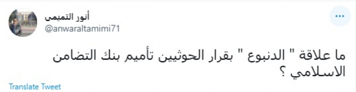 وقال في تغريدة عبر "تويتر" رصدها "المشهد العربي": "ما علاقة الدنبوع بقرار الحوثيين تأميم بنك التضامن الإسلامي؟".