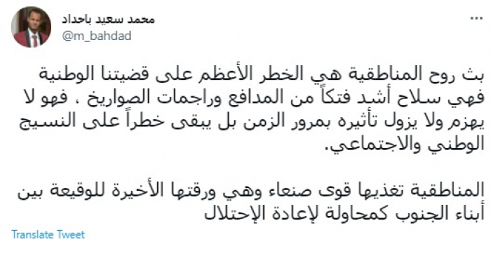 وقال في تغريدة عبر "تويتر" رصدها "المشهد العربي": "بث روح المناطقية هي الخطر الأعظم على قضيتنا الوطنية فهي سلاح أشد فتكًا من المدافع وراجمات الصواريخ".