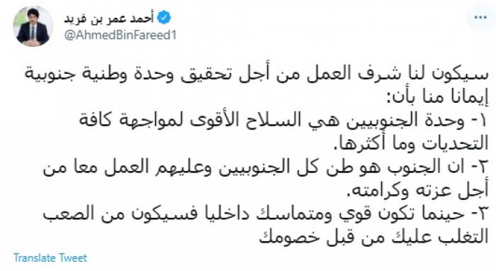 وقال في تغريدة عبر "تويتر" رصدها "المشهد العربي": "سيكون لنا شرف العمل من أجل تحقيق وحدة وطنية جنوبية إيمانا منا بأن: وحدة الجنوبيين هي السلاح الأقوى لمواجهة كافة التحديات وما أكثرها".