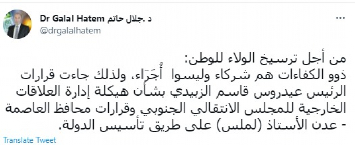 وقال في تغريدة عبر "تويتر" رصدها "المشهد العربي": "من أجل ترسيخ الولاء للوطن: ذوو الكفاءات هم شركاء وليسوا أُجَرَاء".