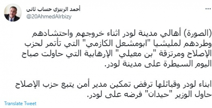 وقال في تغريدة عبر "تويتر" رصدها "المشهد العربي": "(الصورة) أهالي مدينة لودر أثناء خروجهم واحتشادهم وطردهم لمليشيا أبو مشعل الكازمي التي تأتمر لحزب الإصلاح ومرتزقة بن معيلي الإرهابية التي حاولت صباح اليوم السيطرة على مدينة لودر".