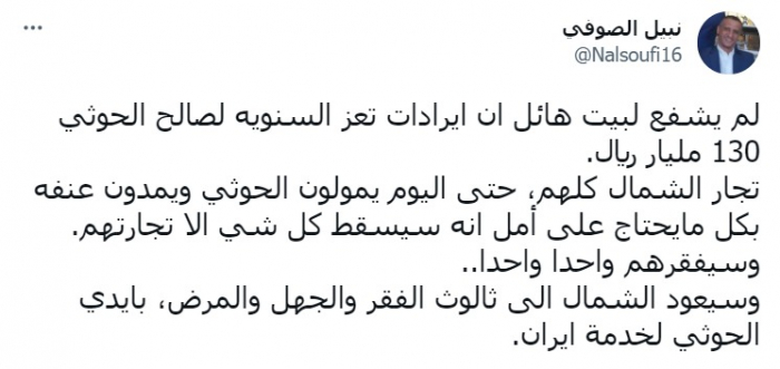 عبر الصحفي نبيل الصوفي، عن أسفه لتمويل تجار الشمال حرب مليشيا الحوثي الإرهابية، من إيرادات تجارتهم، متهمًا شركات هائل سعيد في تعز، بضخ 130 مليار ريال سنويًا إلى خزينة الحوثيين.