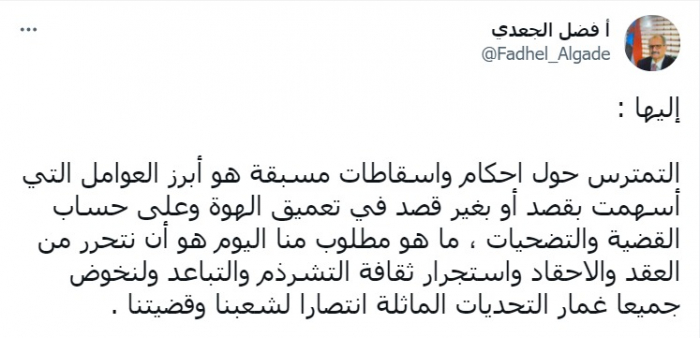 وقال في تغريدة على تويتر، اليوم الخميس إن: "التمترس حول أحكام وإسقاطات مسبقة هو أبرز العوامل التي اسهمت بقصد أو بغير قصد في تعميق الهوة وعلى حساب القضية والتضحيات".