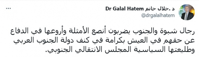 وشدد في تغريدة على تويتر، اليوم الخميس، على أن: "رجال شبوة والجنوب يضربون أنصع الأمثلة وأروعها في الدفاع عن حقهم في العيش بكرامة في كنف دولة الجنوب العربي وطليعتها السياسية المجلس الانتقالي الجنوبي".