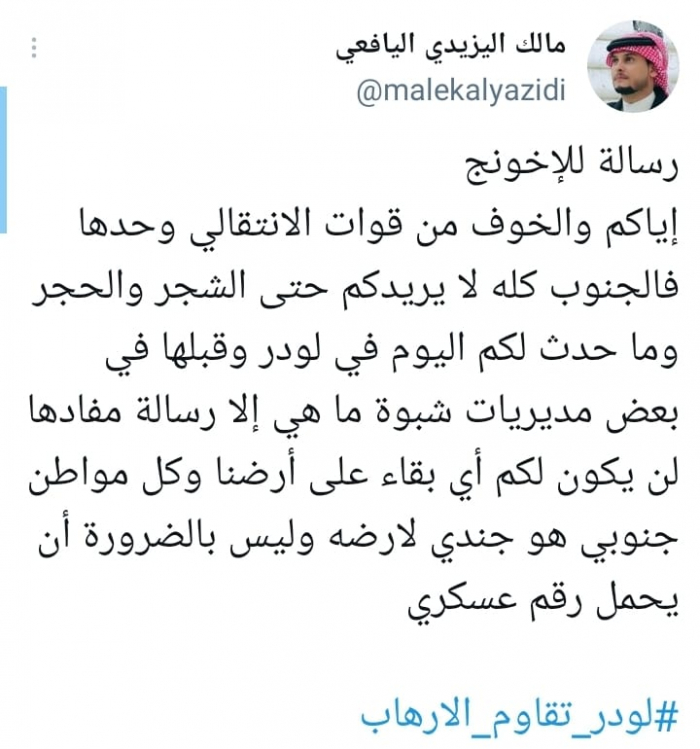 وأضاف موجها حديثه لمليشيات الشرعية الإخوانية أن: "ما حدث لكم اليوم في لودر وقبلها في بعض مديريات شبوة ما هي إلا رسالة مفادها لن يكون لكم أي بقاء على أرضنا وكل مواطن جنوبي هو جندي لأرضه وليس بالضرورة أن يحمل رقم عسكري"، مختتما بهاشتاج: "لودر تقاوم الإرهاب".
