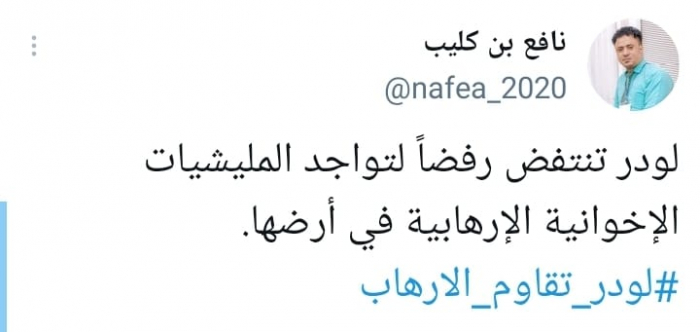 وكشف في تغريدة على حسابه بموقع التدوين المصغر تويتر، اليوم أن: "لودر تنتفض رفضا لتواجد المليشيات الإخوانية الإرهابية في أرضها"، مختتما بهاشتاج: "لودر تقاوم الإرهاب".