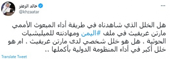 وقال في تغريدة عبر "تويتر" رصدها "المشهد العربي": "هل الخلل الذي شاهدناه في طريقة أداء المبعوث الأممي مارتن غريفيث في ملف اليمن ومهادنته للميليشيات الحوثية".