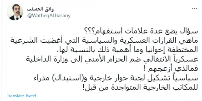وقال في تغريدة عبر "تويتر" رصدها "المشهد العربي": "سؤال يضع عدة علامات استفهام؟..ما هي القرارات العسكرية والسياسية التي أغضبت الشرعية المختطفة إخوانيًا وما أهمية ذلك بالنسبة لها".