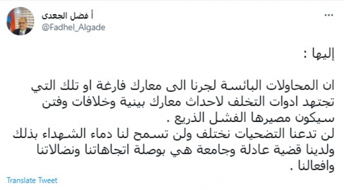 وكتب في تغريدة عبر "تويتر" رصدها "المشهد العربي": "إن المحاولات البائسة لجرنا إلى معارك فارغة أو تلك التي تجتهد أدوات التخلف لإحداث معارك بينية وخلافات وفتن سيكون مصيرها الفشل الذريع".