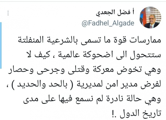 استنكر فضل الجعدي عضو هيئة رئاسة المجلس الانتقالي الجنوبي، إرهاب الشرعية الإخوانية لأبناء مدينة لودر، ودفع مليشياتها لخوض معركة لاقتحام المدينة، معتبرا أنها شرعية منفلتة.
