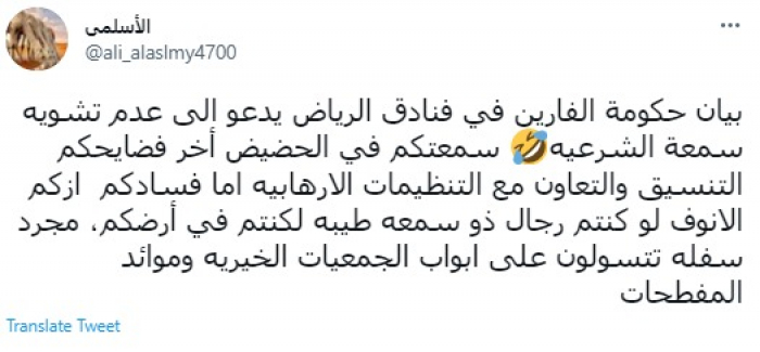 وكتب في تغريدة عبر "تويتر" رصدها "المشهد العربي": "بيان حكومة الفارين في الفنادق يدعو إلى عدم تشويه سمعة الشرعية".