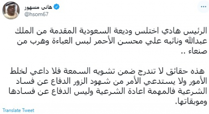 وقال في تغريدة عبر "تويتر" رصدها "المشهد العربي": "الرئيس هادي اختلس وديعة السعودية المقدمة من الملك عبدالله ونائبه علي محسن الأحمر لبس العباءة وهرب من صنعاء".