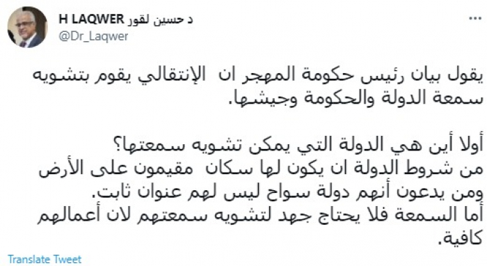 وكتب في تغريدة عبر "تويتر" رصدها "المشهد العربي": "يقول بيان رئيس حكومة المهجر أن الانتقالي يقوم بتشويه سمعة الدولة والحكومة وجيشها".