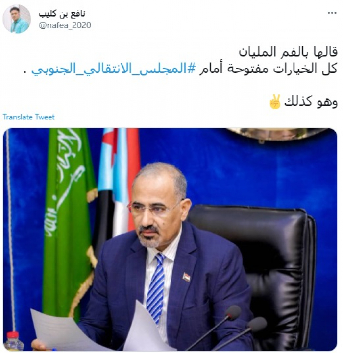 نشر الناشط السياسي نافع بن كليب، اليوم السبت، صورة لرئيس المجلس الانتقالي الجنوبي الرئيس عيدروس الزُبيدي، مؤكدًا أن كل الخيارات مفتوحة أمام المجلس كما قال الزُبيدي.