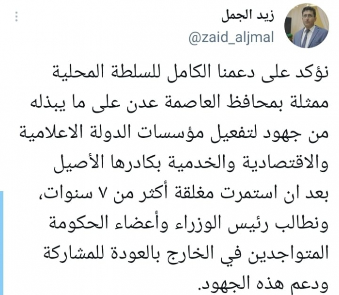 وقال في تغريدة على حسابه بموقع التدوين المصغر تويتر، اليوم: "نؤكد دعمنا الكامل للسلطة المحلية ممثلة بمحافظ العاصمة عدن على ما يبذله من جهود لتفعيل مؤسسات الدولة الإعلامية والاقتصادية والخدمية بكادرها الأصيل بعد أن استمرت مغلقة أكثر من 7 سنوات".