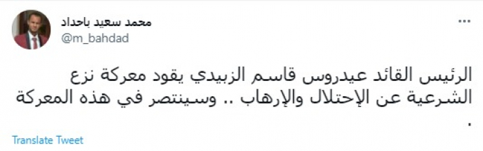 وكتب في تغريدة عبر "تويتر" رصدها "المشهد العربي": "الرئيس القائد عيدروس قاسم الزُبيدي يقود معركة نزع الشرعية عن الاحتلال والإرهاب.. وسينتصر في هذه المعركة".