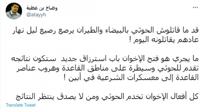 وأضاف: "ما يجري هو فتح الإخوان باب استرزاق جديد ستكون نتائجه تقدم للحوثي وسيطرة على مناطق القاعدة وهروب عناصر القاعدة إلى معسكرات الشرعية في أبين".