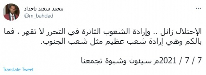 وكتب في تغريدة عبر "تويتر" رصدها "المشهد العربي": "الاحتلال زائل .. وإرادة الشعوب الثائرة في التحرر لا تقهر ، فما بالكم وهي إرادة شعب عظيم مثل شعب الجنوب".