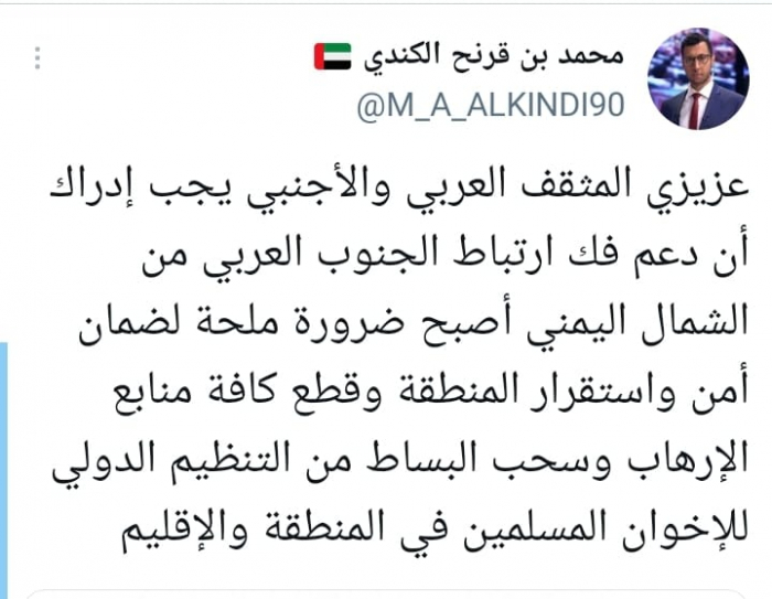 اعتبر الكاتب الصحفي محمد الكندي أن فك ارتباط دولة الجنوب العربي عن اليمن ضمانة لاستقرار المنطقة وتجفيف منابع الإرهاب وتحجيم لتنظيم الإخوان الإرهابي.