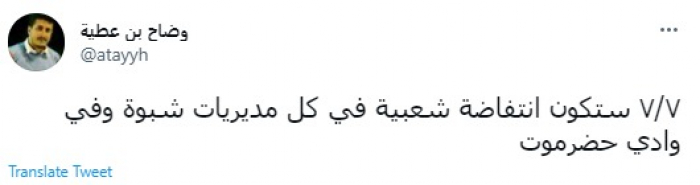 وكتب في تغريدة عبر "تويتر" رصدها "المشهد العربي": "7/7 ستكون انتفاضة شعبية في كل مديريات شبوة وفي وادي حضرموت".