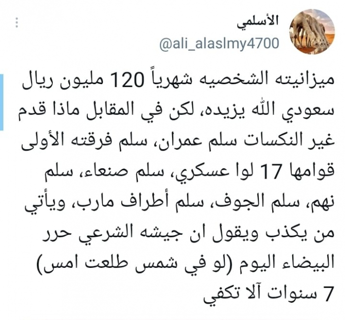 وتساءل: "لكن في المقابل ماذا قدم غير النكسات؟"، مؤكدا أنه: "سلم عمران، سلم فرقته الأولى قوامها 17 لواء عسكري، سلم صنعاء، سلم نهم، سلم الجوف، سلم أطراف مأرب".