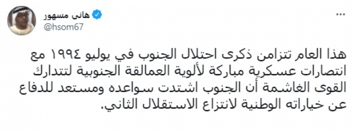 وكتب في تغريدة عبر "تويتر" رصدها "المشهد العربي": "هذا العام تتزامن ذكرى احتلال الجنوب في يوليو 1994 مع انتصارات عسكرية مباركة لألوية العمالقة الجنوبية".
