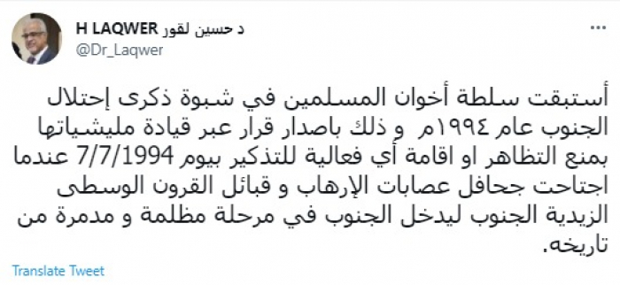 وقال في تغريدة عبر "تويتر" رصدها "المشهد العربي": "استبقت سلطة إخوان المسلمين في شبوة ذكرى احتلال الجنوب عام 1994م باصدار قرار عبر قيادة مليشياتها بمنع التظاهر أو إقامة أي فعالية للتذكير بيوم 7/7/1994".