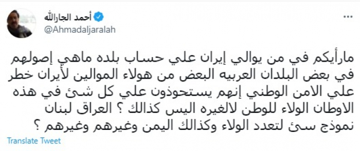 وقال في تغريدة عبر "تويتر" رصدها "المشهد العربي": "ما رأيكم في من يوالي إيران على حساب بلده ما هي أصولهم في بعض البلدان العربية البعض من هولاء الموالين لإيران خطر على الأمن الوطني إنهم يستحوذون على كل شيء في هذه الأوطان الولاء للوطن لا لغيره اليس كذالك؟".