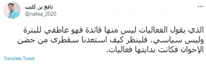 وقال في تغريدة عبر "تويتر" رصدها "المشهد العربي": "الذي يقول الفعاليات ليس منها فائدة فهو عاطفي للبترة وليس سياسي، فلينظر كيف استعدنا سقطرى من حضن الإخوان فكانت بدايتها فعاليات".