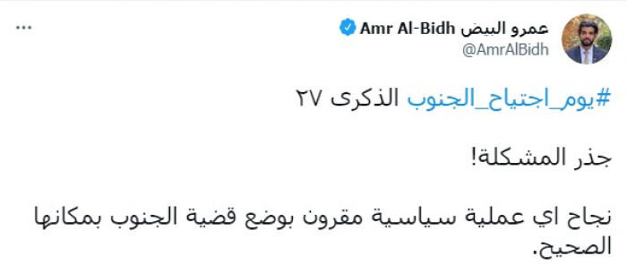 وأشار في تغريدة على حسابه بتويتر، إلى حلول ذكرى: "يوم اجتياح الجنوب الذكرى الـ 27"، في إشارة إلى طول أمد الصراع دون الاستجابة لسلمية الجنوبيين.
