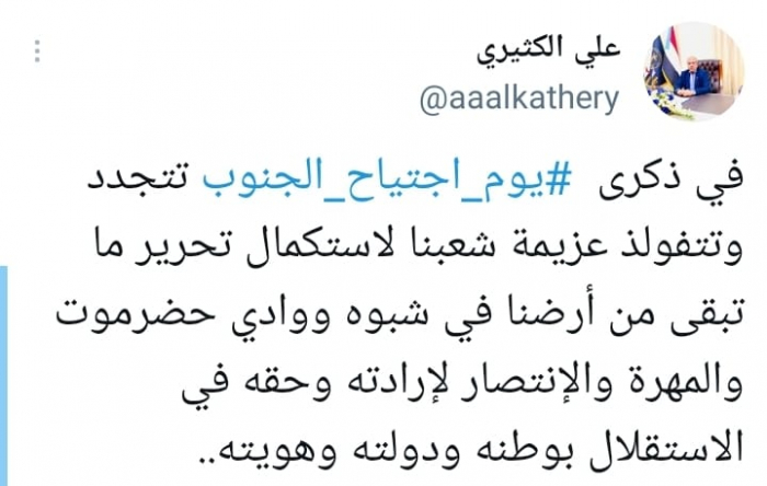 وأشار في تغريدة على حسابه بموقع التدوين المصغر تويتر، اليوم إلى أنه: "في ذكرى يوم اجتياح الجنوب، تتجدد وتتفولذ عزيمة شعبنا لاستكمال تحرير ما تبقى من أرضنا في شبوة ووادي حضرموت والمهرة"، مشددا على: "الانتصار لإرادته وحقه في الاستقلال بوطنه ودولته وهويته".