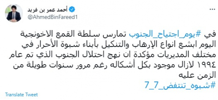وكتب في تغريدة عبر "تويتر" رصدها "المشهد العربي": "في يوم اجتياح الجنوب تمارس سلطة القمع الإخونجية اليوم أبشع أنواع الإرهاب والتنكيل بأبناء شبوة الأحرار في مختلف المديريات".