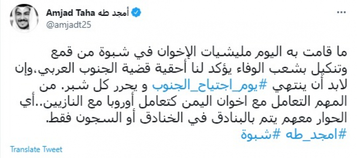 وقال في تغريدة عبر "تويتر" رصدها "المشهد العربي": "ما قامت به اليوم مليشيات الإخوان في شبوة من قمع وتنكيل بشعب الوفاء يؤكد لنا أحقية قضية الجنوب العربي، وإن لا بد أن ينتهي يوم اجتياح الجنوب ويحرر كل شبر".