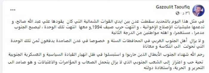 وكتب في منشور عبر "فيس بوك" رصده "المشهد العربي": "في مثل هذا اليوم بالتحديد سقطت عدن بين أيدي القوات الشمالية التي كان يقودها علي عبد الله صالح، وتدعمها مليشيات الإصلاح الإخوانية، وانتهت حرب صيف 1994 ومعها انتهت تلك الوحدة، ليصبح الجنوب مدمرًا، مستعمرًا، وأهله من المواطنين من الدرجة الثانية".