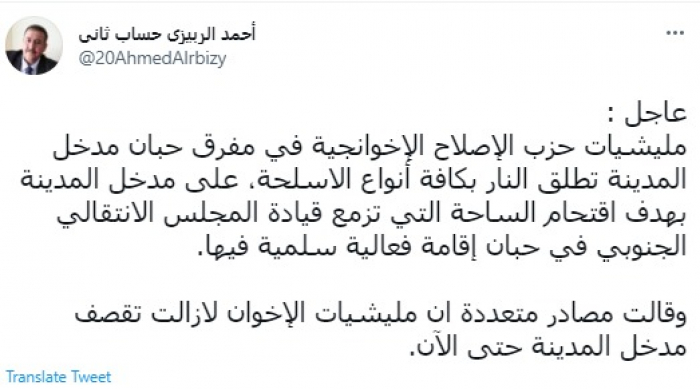 وأضاف: "وقالت مصادر متعددة إن مليشيات الإخوان لا زالت تقصف مدخل المدينة حتى الآن".