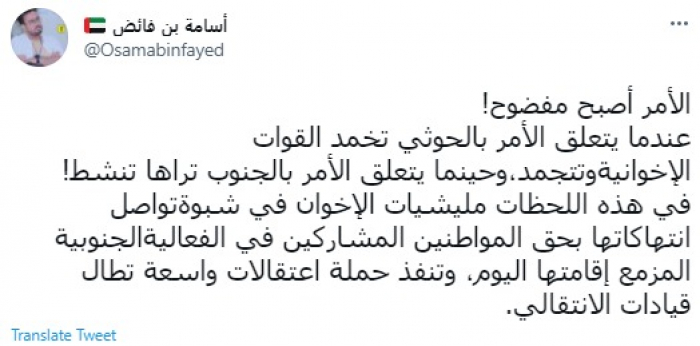 وقال في تغريدة عبر "تويتر" رصدها "المشهد العربي": "الأمر أصبح مفضوحا!.. عندما يتعلق الأمر بالحوثي تخمد القوات الإخوانية وتتجمد، وحينما يتعلق الأمر بالجنوب تراها تنشط".
