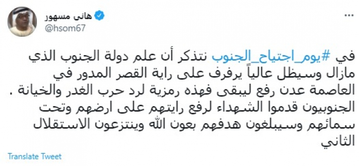 وقال في تغريدة عبر "تويتر" رصدها "المشهد العربي": "في يوم اجتياح الجنوب نتذكر أن علم دولة الجنوب الذي ما زال وسيظل عاليًا يرفرف على راية القصر المدور في العاصمة عدن رفع ليبقى فهذه رمزية لرد حرب الغدر والخيانة".