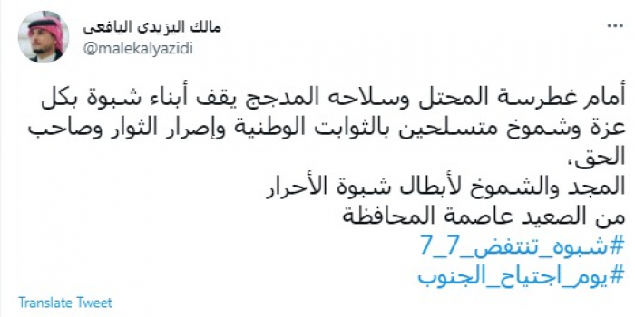 واختتم تغريدته بهاشتاجات: "شبوة تنتفض7-7.. يوم اجتياح الجنوب".