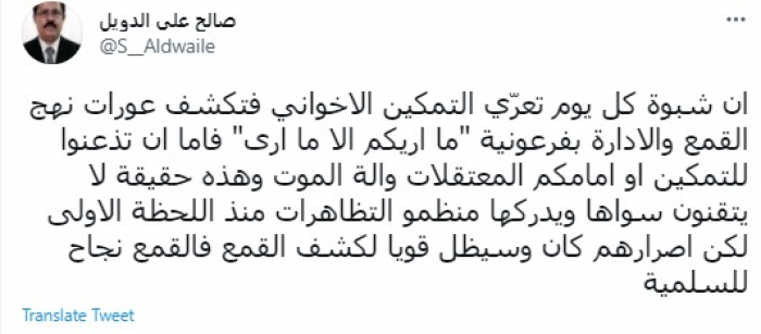 وكتب في تغريدة عبر "تويتر" رصدها "المشهد العربي": "إن شبوة كل يوم تعرّي التمكين الإخواني فتكشف عورات نهج القمع والإدارة بفرعونية ما أريكم إلا ما أرى".