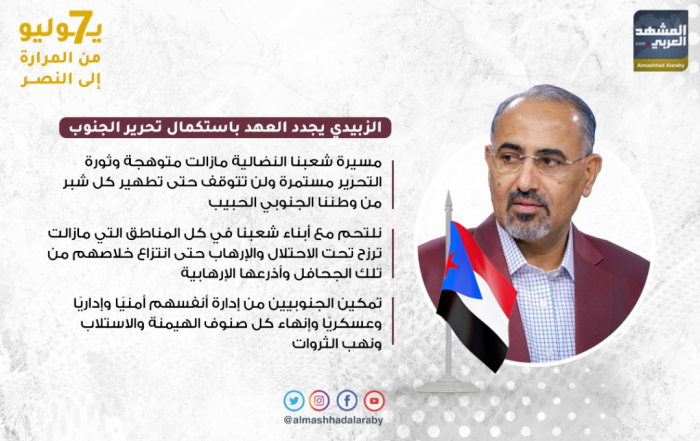 7 يوليو من المرارة إلى النصر.. الزُبيدي يجدد العهد باستكمال تحرير الجنوب (إنفوجراف)