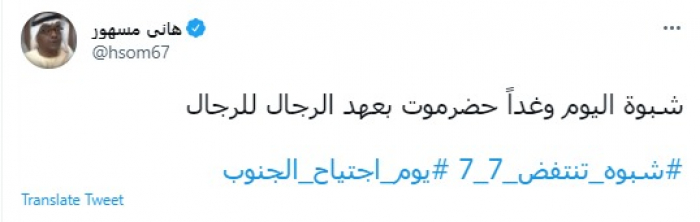 واختتم تغريدته بهاشتاجات: "شبوة تنتفض 7-7.. يوم اجتياح الجنوب".