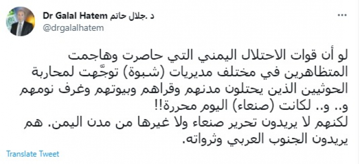 وقال في تغريدة عبر "تويتر" رصدها "المشهد العربي": "لو أن قوات الاحتلال اليمني التي حاصرت وهاجمت المتظاهرين في مختلف مديريات (شبوة) توجَّهت لمحاربة الحوثيين الذين يحتلون مدنهم وقراهم وبيوتهم وغرف نومهم و.. و.. لكانت (صنعاء) اليوم محررة".
