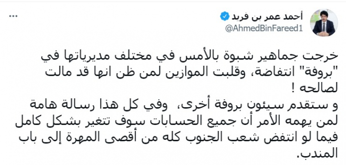 بن فريد: انتفاضة الجنوب كفيلة بتغيير الواقع كليًا